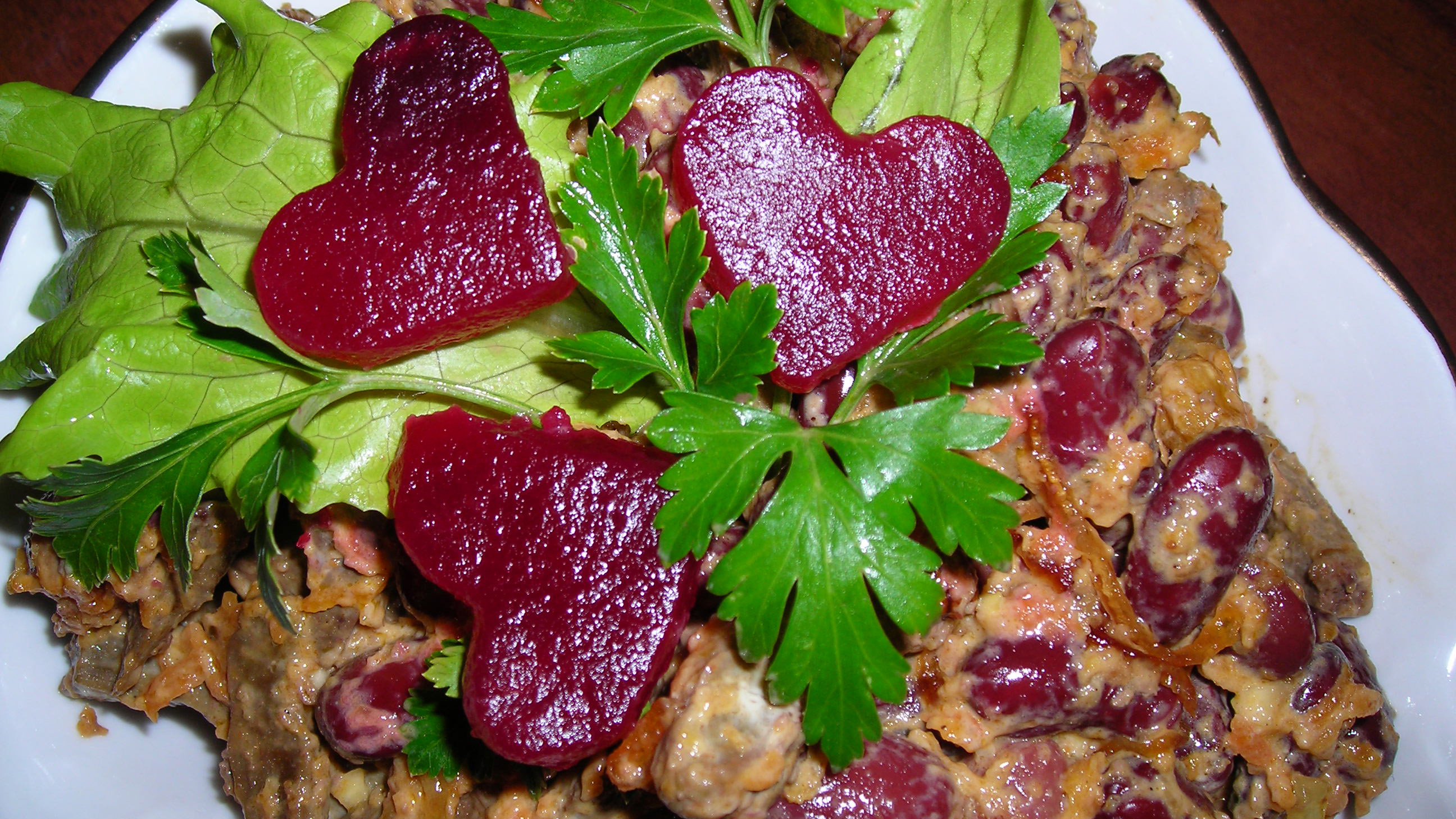 К фасолевой салатной основе добавить печень, измельчённые грецкие орехи и рубленый чеснок, поперчить, заправить нежирной сметаной и хорошо перемешать. Готовый салат украсить зеленью.